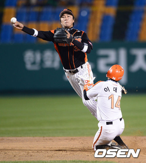 롯데가 1회초부터 기선제압에 성공했다. 1번타자 김문호가 중전 안타를 치고 나간 뒤 2루 도루에 실패하며 흐름이 끊기는 듯했으나 볼넷으로 출루한 손아섭이 2루 베이스를 훔치며 2사 2루 찬스를 잡았다. 이어 4번타자 김대우가 한화 선발 데니 바티스타의 5구째 가운데 높은 148km 직구를 통타, 우중간 담장을 훌쩍 넘어가는 비거리 120m 선제 투런 홈런을 터뜨렸다. 프로 데뷔 첫 홈런.