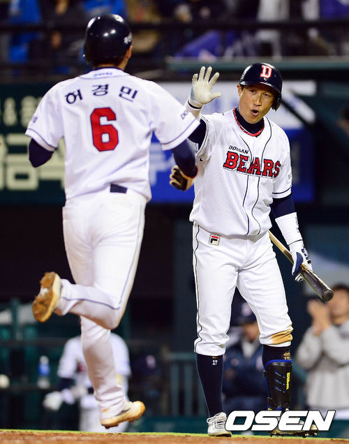 2일 오후 서울 잠실구장에서 열린 '2013 한국야쿠르트 세븐 프로야구' 두산 베어스와 KIA 타이거즈의 경기 7회말 2사 1루 양의지의 1타점 2루타 상황, 임재철이 홈을 밟는 1루주자 허경민과 하이파이브를 하고 있다.