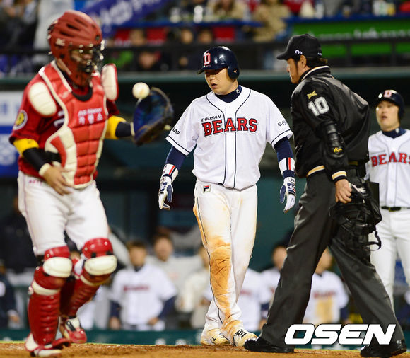 2일 오후 서울 잠실구장에서 열린 '2013 한국야쿠르트 세븐 프로야구' 두산 베어스와 KIA 타이거즈의 경기 7회말 2사 2루 임재철의 좌익수 앞 1루타 상황, 홈으로 쇄도하던 2루주자 양의지가 홈에서 태그아웃 당한 후 아쉬워 하고 있다.