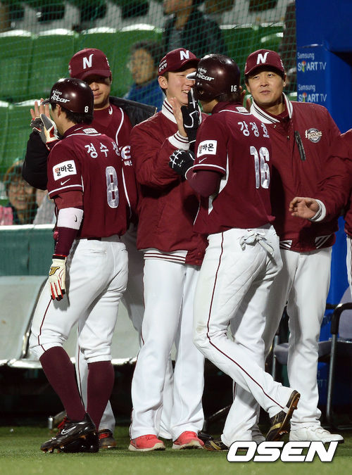 2일 오후 대구구장에서 열린 '2013 한국야쿠르트 세븐 프로야구' 삼성 라이온즈와 넥센 히어로즈의 경기 9회초 1사 1,2루 넥센 김민성의 안타로 득점을 올린 정수성, 강정호가 동료들과 기뻐하고 있다.