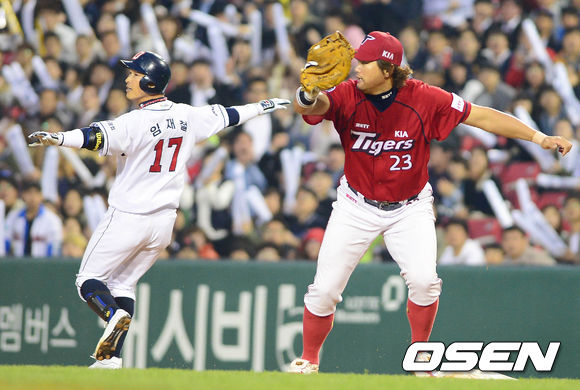 병살 판정이 나오지 않으며 2사 만루. 타석에 들어선 박건우는 상대 선발 김진우와 풀카운트까지 가는 대결을 펼친 뒤 김진우의 공을 그대로 끌어당겼다. 이는 이범호 앞으로 향했으나 강하게 튀어오른 강습안타. 최준석과 양의지가 모두 홈을 밟으며 두산의 2-0 선취점으로 이어졌다.