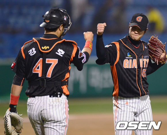 경기 종료후 롯데 강민호 포수와 김성배가 승리의 기쁨을 나누고 있다./ ajyoung@osen.co.kr