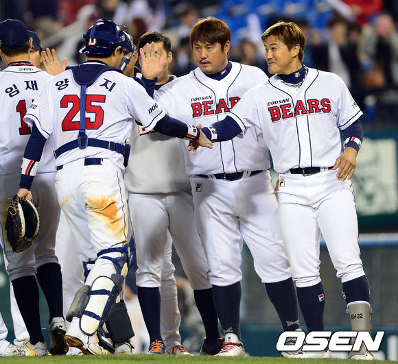 2일 오후 서울 잠실구장에서 열린 '2013 한국야쿠르트 세븐 프로야구' 두산 베어스와 KIA 타이거즈의 경기 종료 후 홍성흔과 양의지가 하이파이브를 하고 있다.