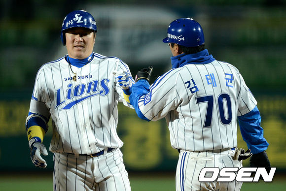 2일 오후 대구구장에서 열린 '2013 한국야쿠르트 세븐 프로야구' 삼성 라이온즈와 넥센 히어로즈의 경기 9회말 2사 1,3루 삼성 최형우가 1타점 적시타를 때리고 1루 김태균 코치와 기뻐하고 있다.