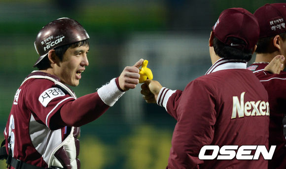 경기 종료 후 승리를 거둔 넥센 박동원이 송신영과 엄지손가락 세레머니를 하고 있다. / youngrae@osen.co.kr