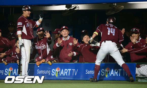 연장 10회초 1사 만루 삼성 이우선의 폭투로 득점을 올린 넥센 서건창이 동료들과 기뻐하고 있다. / youngrae@osen.co.kr