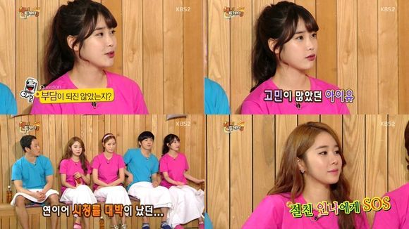 아이유는 2일 오후 방송된 KBS 2TV '해피투게더'에서 "첫 주연이 부담됐는데 유인나씨가 강력추천해줬다"라고 밝혔다.