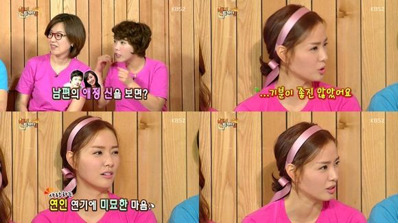 그는 이날 방송에서 "남편의 키스신을 보는 심경은 어떤가"라는 질문에 "솔직히 기분이 좋지는 않았다"라고 답했다.