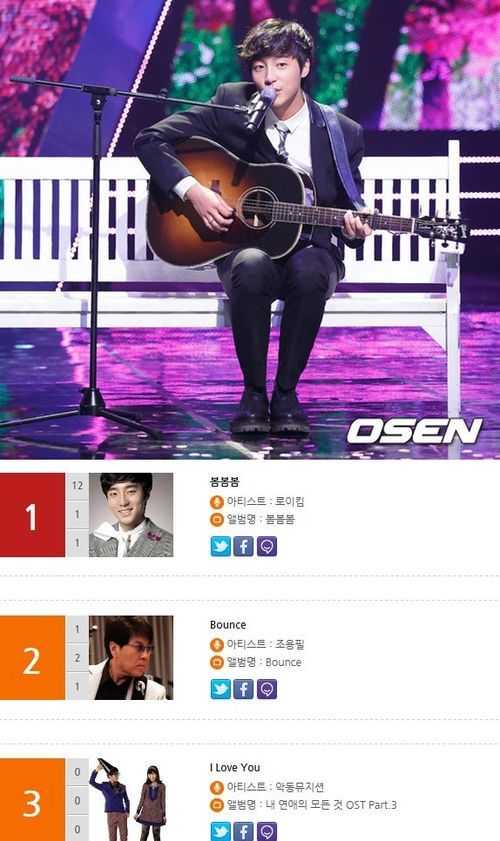 한편 해당 차트에서는 1위 로이킴을 비롯해 2위에는 조용필의 '바운스(Bounce)', 3위에는 악동뮤지션의 '아이러브유(I love you)'가 이름을 올렸다.