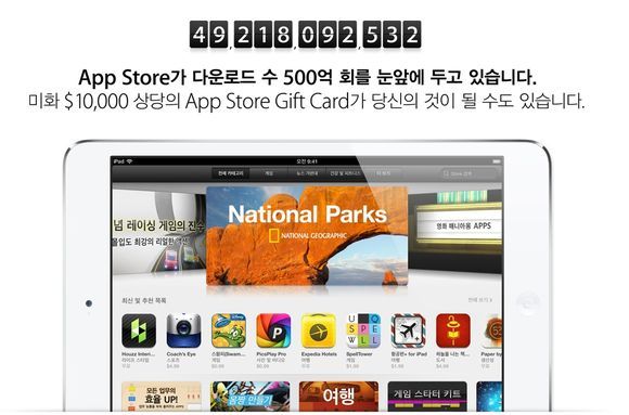 전 세계적으로 진행되는 이번 이벤트는 500억번째로 앱을 다운로드하는 이에게 1만 달러 상당의 앱스토어 기프트 카드를 주고, 그 이후 앱을 다운로드하는 50명에게도 각각 500달러(약 55만원)상당의 앱스토어 기프트 카드를 준다.