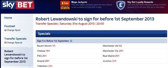영국 베팅전문 스카이 베트는 3일(이하 한국시간) 흥미로운 종목을 개설했다. 레반도프스키가 여름 이적시장이 끝나는 오는 9월 1일 이전 어느 팀과 계약했을지에 대한 스페셜 베팅이 그것이다.