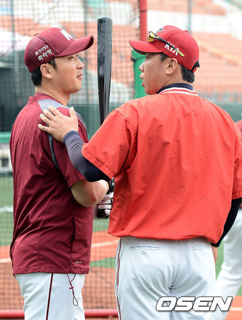 3일 오후 서울 목동구장에서 열리는 '2013 한국야쿠르트 세븐 프로야구' 넥센 히어로즈와 KIA 타이거즈의 경기에 앞서 KIA 이범호와 넥센 이택근이 이야기를 나누고 있다.