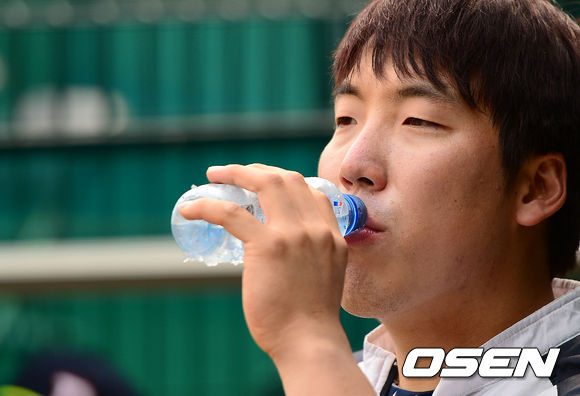 3일 오후 서울 잠실야구장에서 열린 2013 한국야쿠르트 세븐프로야구 두산 베어스와 LG 트윈스의 경기, 경기에 앞서 두산 김현수가 덕아웃에서 물을 마시고 있다.