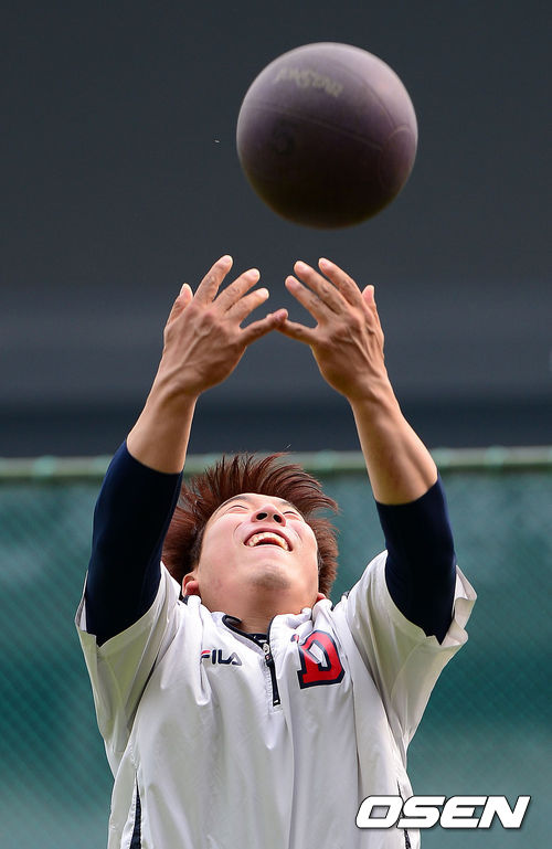 3일 오후 서울 잠실야구장에서 열린 2013 한국야쿠르트 세븐프로야구 두산 베어스와 LG 트윈스의 경기, 경기에 앞서 두산 김현수가 체력 훈련을 하고 있다.