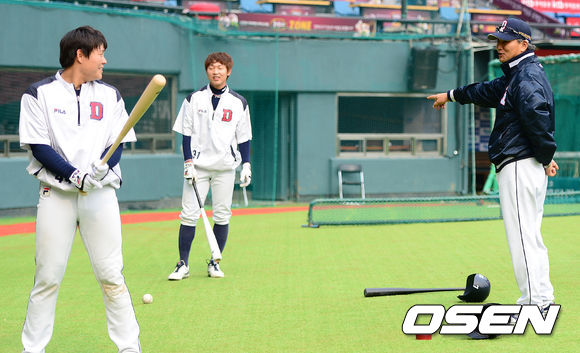 3일 오후 서울 잠실야구장에서 열린 2013 한국야쿠르트 세븐프로야구 두산 베어스와 LG 트윈스의 경기, 경기에 앞서 두산 김진욱 감독이 훈련 중인 박세혁, 정수빈과 이야기를 나누고 있다.