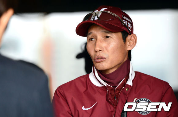 3일 오후 서울 목동구장에서 열리는 '2013 한국야쿠르트 세븐 프로야구' 넥센 히어로즈와 KIA 타이거즈의 경기에 앞서 넥센 염경엽 감독이 취재진들과 이야기를 나누고 있다.