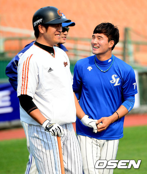 3일 오후 부산 사직구장에서 열리는 롯데 자이언츠와 삼성 라이온스의 경기, 경기에 앞서 롯데 강민호와 삼성 김상수가 이야기를 나누고 있다.