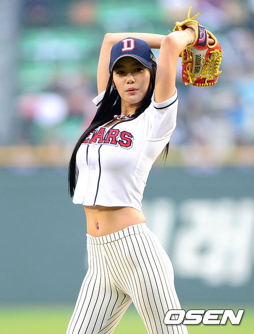 3일 오후 서울 잠실야구장에서 열린 2013 한국야쿠르트 세븐프로야구 두산 베어스와 LG 트윈스의 경기, 경기에 앞서 배우 클라라가 시구를 하고 있다.