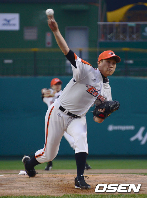 3일 오후 대전구장에서 열린 '2013 한국야쿠르트 세븐 프로야구' 한화 이글스와 SK 와이번즈 경기,한화 선발 김혁민이 공을 뿌리고 있다.