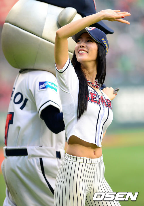 3일 오후 서울 잠실야구장에서 열린 2013 한국야쿠르트 세븐프로야구 두산 베어스와 LG 트윈스의 경기, 경기에 앞서 배우 클라라가 관중석을 향해 인사를 하고 있다.