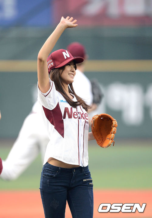 3일 오후 서울 목동구장에서 열린 '2013 한국야쿠르트 세븐 프로야구' 넥센 히어로즈와 KIA 타이거즈의 경기전 AOA 설현이 팬들에게 인사를 하고 있다.