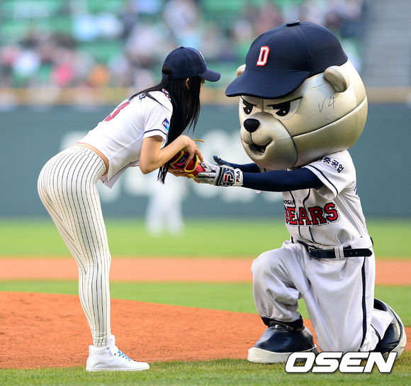 3일 오후 서울 잠실야구장에서 열린 2013 한국야쿠르트 세븐프로야구 두산 베어스와 LG 트윈스의 경기, 경기에 앞서 배우 클라라가 두산 마스코트에게 시구 공을 전달 받고 있다.