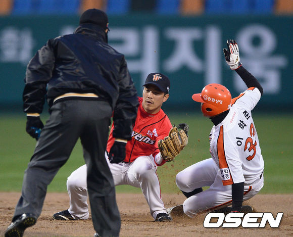 3일 오후 대전구장에서 열린 '2013 한국야쿠르트 세븐 프로야구' 한화 이글스와 SK 와이번즈 경기,1회말 무사 1,3루 최진행 삼진아웃처리때 1루주자 이학준 2루도루에 성공하고 있다.