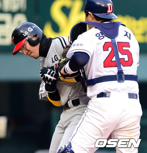 3일 오후 서울 잠실야구장에서 열린 2013 한국야쿠르트 세븐프로야구 두산 베어스와 LG 트윈스의 경기, 1회초 1사 2,3루에서 LG 손주인의 내야 땅볼 때 홈으로 쇄도한 3루주자 정성훈이 두산 포수 양의지에 태그 아웃 당하고 있다.