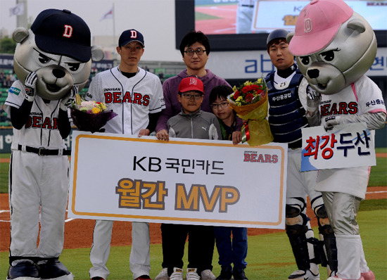 두산베어스는(사장 김승영)는 3일 잠실 LG전 경기에 앞서 팀 자체적으로 선정하는 『KB 국민카드』4월 MVP 시상식을 실시했다. 4월 MVP는 투수 부문에 오현택, 타자 부문에 양의지가 각각 선정되었다.
