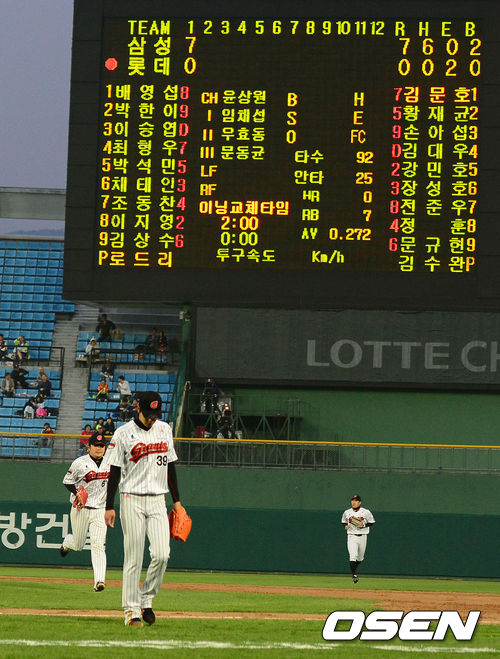 3일 오후 부산 사직구장에서 열린 롯데 자이언츠와 삼성 라이온스의 경기, 1회초 수비에서 롯데가 7실점을 허용하며 수비를 마치고 더그아웃으로 향하고 있다.