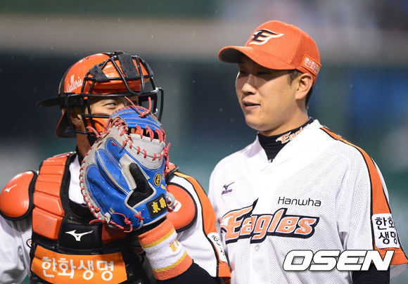 3일 오후 대전구장에서 열린 '2013 한국야쿠르트 세븐 프로야구' 한화 이글스와 SK 와이번즈 경기,3회초 수비를 마친 한화선발 김혁민이 정범모포수와 이야기를 나누며 덕아웃을 향하고 있다.