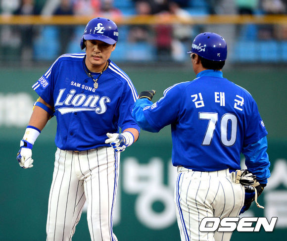 3일 오후 부산 사직구장에서 열린 롯데 자이언츠와 삼성 라이온스의 경기, 1회초 1사 1,2루에서 삼성 이승엽이 선제 1타점 적시타를 날리고 김태균 코치와 주먹을 맞대고 있다.