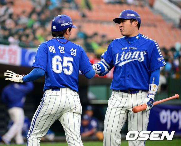 3일 오후 부산 사직구장에서 열린 롯데 자이언츠와 삼성 라이온스의 경기, 1회초 1사 1,2루에서 삼성 이승엽의 선제 1타점 적시타에 홈을 밟은 배영섭이 최형우와 하이파이브를 하며 이야기를 나누고 있다.
