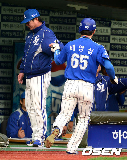 3일 오후 부산 사직구장에서 열린 롯데 자이언츠와 삼성 라이온스의 경기, 1회초 1사 1,2루에서 삼성 배영섭이 이승엽의 선제 1타점 적시타에 홈을 밟고 더그아웃에서 류중일 감독과 하이파이브를 하고 있다.