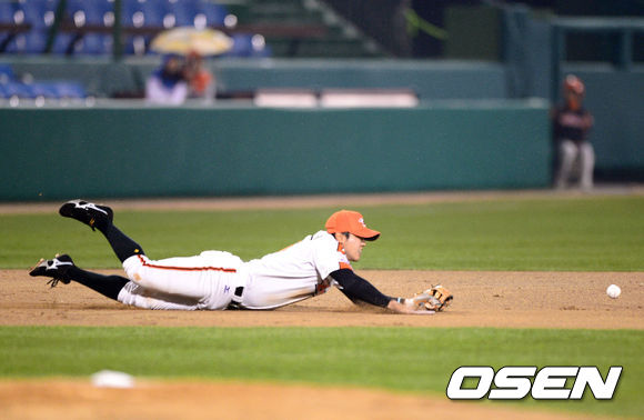 3일 오후 대전구장에서 열린 '2013 한국야쿠르트 세븐 프로야구' 한화 이글스와 SK 와이번즈 경기,4회초 2사 박정권의 3루수 옆을 가르는 안타때 한화 오선진 3루수가 다이빙캐치를 시도하였으나 안타를 허용하고 있다.