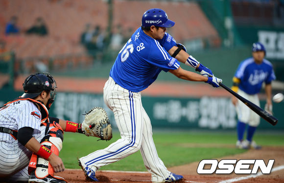3일 오후 부산 사직구장에서 열린 롯데 자이언츠와 삼성 라이온스의 경기, 1회초 2사 2,3루에서 삼성 이지영이 2타점 적시타를 날리고 있다.