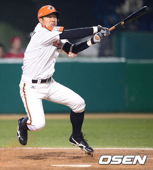 3일 오후 대전구장에서 열린 '2013 한국야쿠르트 세븐 프로야구' 한화 이글스와 SK 와이번즈 경기,4회말 무사1루 이양기 점프를 하며 우전안타를 날리고 있다.