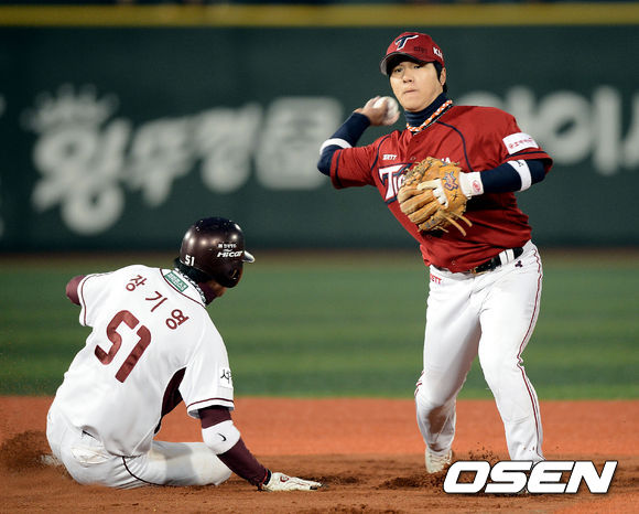 3일 오후 서울 목동구장에서 열린 '2013 한국야쿠르트 세븐 프로야구' 넥센 히어로즈와 KIA 타이거즈의 경기, 4회말 1사 1루 KIA 김선빈이 넥센 이택근의 타구를 잡아 1루 주자 장기영을 포스아웃 시키고 1루로 송구하고 있다.