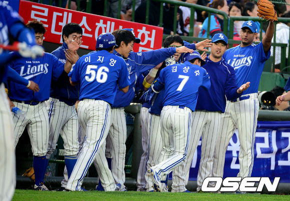 3일 오후 부산 사직구장에서 열린 롯데 자이언츠와 삼성 라이온스의 경기, 1회초 2사 2루에서 삼성 김상수가 투런포를 날리고 더그아웃에서 동료선수들의 축하를 받고 있다.