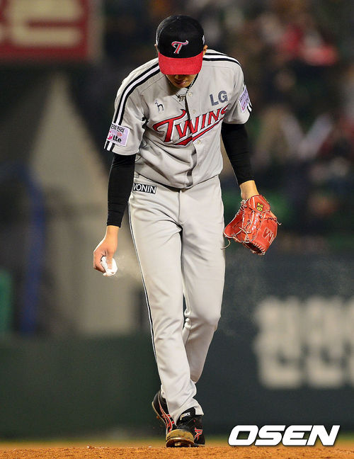 3일 오후 서울 잠실야구장에서 열린 2013 한국야쿠르트 세븐프로야구 두산 베어스와 LG 트윈스의 경기, 4회말 무사에서 두산 홍성흔에게 좌월 솔로 홈런을 허용한 LG 임찬규가 로진 가루를 만지고 있다.