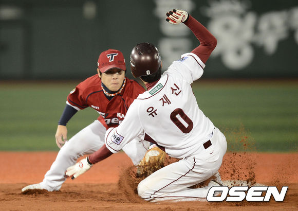3일 오후 서울 목동구장에서 열린 '2013 한국야쿠르트 세븐 프로야구' 넥센 히어로즈와 KIA 타이거즈의 경기, 7회말 1사 1루 넥센 유재신이 2루 도루를 시도하였지만 KIA 김선빈에게 태그아웃 당하고 있다.