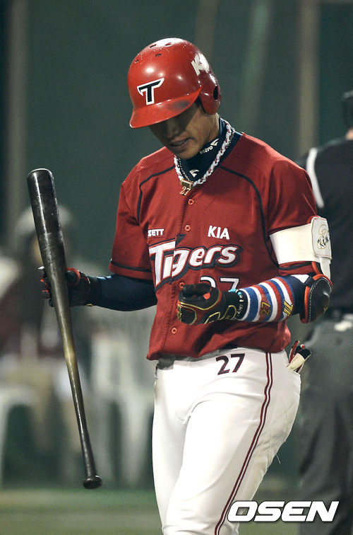 3일 오후 서울 목동구장에서 열린 '2013 한국야쿠르트 세븐 프로야구' 넥센 히어로즈와 KIA 타이거즈의 경기, 8회초 2사 만루 KIA 김상현이 삼진을 당한 뒤 더그아웃으로 들어오고 있다.
