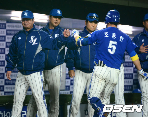 3일 오후 부산 사직구장에서 열린 롯데 자이언츠와 삼성 라이온스의 경기, 8회초 2사에서 삼성 조동찬이 솔로포를 날리고 더그아웃에서 류중일 감독과 주먹을 맞대고 있다.
