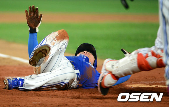 3일 오후 부산 사직구장에서 열린 롯데 자이언츠와 삼성 라이온스의 경기, 8회초 2사 1,2루에서 삼성 최형우의 우전안타에 2루주자 배영섭이 홈까지 파고들었지만 롯데 용덕한에 태그아웃당하고 있다.