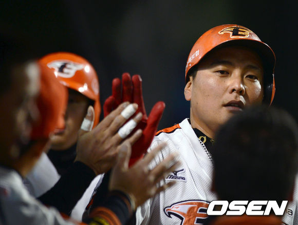 3일 오후 대전구장에서 열린 '2013 한국야쿠르트 세븐 프로야구' 한화 이글스와 SK 와이번즈 경기,7회말 무사 2,3루 이양기 2타점 적시타때 3루 주자 김태균 홈에서 득점을 올리며 동료들의 축하를 받고 있다.