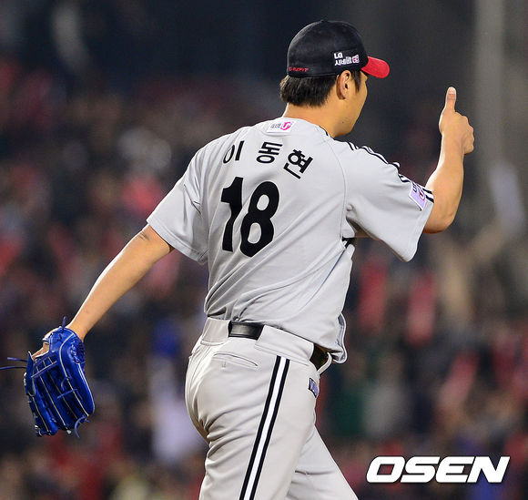 3일 오후 서울 잠실야구장에서 열린 2013 한국야쿠르트 세븐프로야구 두산 베어스와 LG 트윈스의 경기, 6회말 무사 1,2루에서 LG 이동현이 두산 김동주를 병살 처리하고 동료들을 향해 엄지를 들어 올리고 있다.