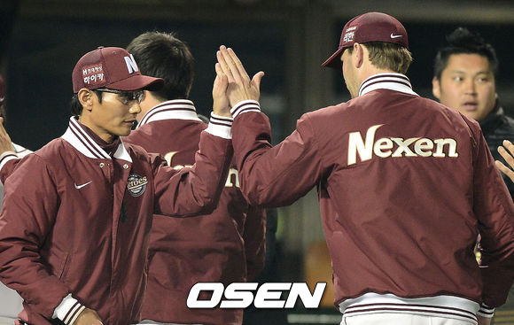 경기 종료 후 승리를 거둔 넥센 염경엽 감독이 밴 헤켄과 하이파이브를 하고 있다. / youngrae@osen.co.kr