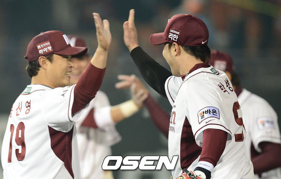 경기 종료 후 승리를 거둔 넥센 송신영과 박병호가 기뻐하고 있다. / youngrae@osen.co.kr