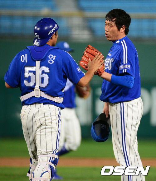 경기후 삼성 이지영과 신용운이 승리를 기뻐하고 있다./jpnews@osen.co.kr