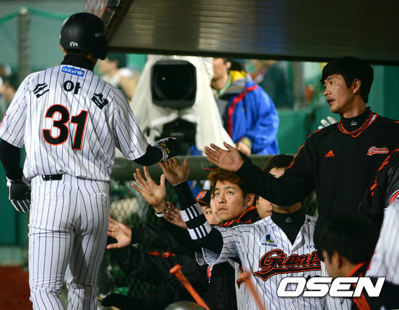 9회말 1사 1,2루에서 롯데 손아섭이 장성호의 1타점 적시타에 홈을 밟고 더그아웃에서 동료선수들과 하이파이브를 하고 있다./jpnews@osen.co.kr